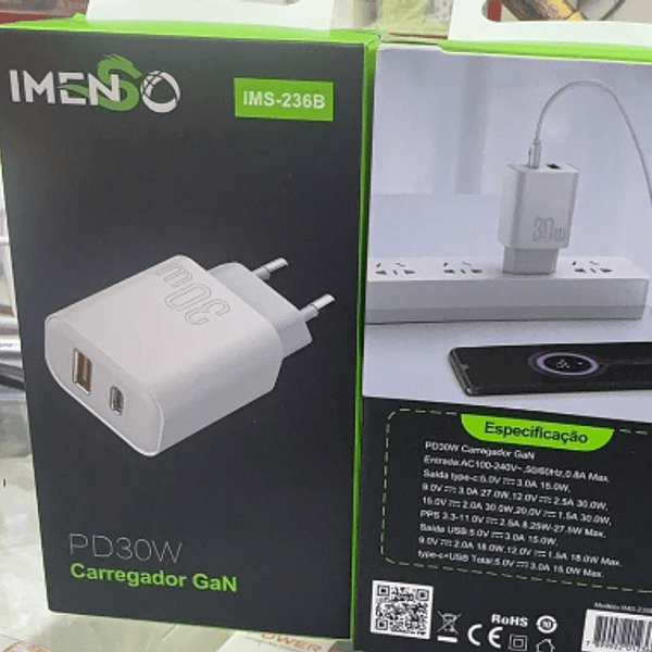 Caixa de Carregamento Ultra Rápido GaN PD 30W com Dupla Saída Imenso