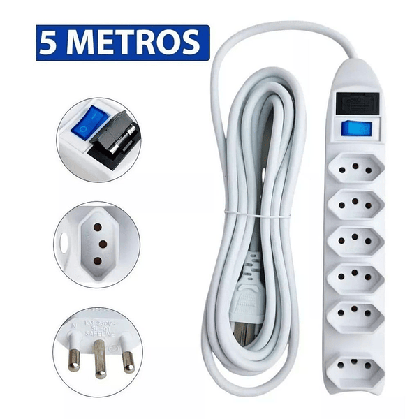 Extensão elétrica 5 Metros 6 Tomadas Compacta Filtro de Linha