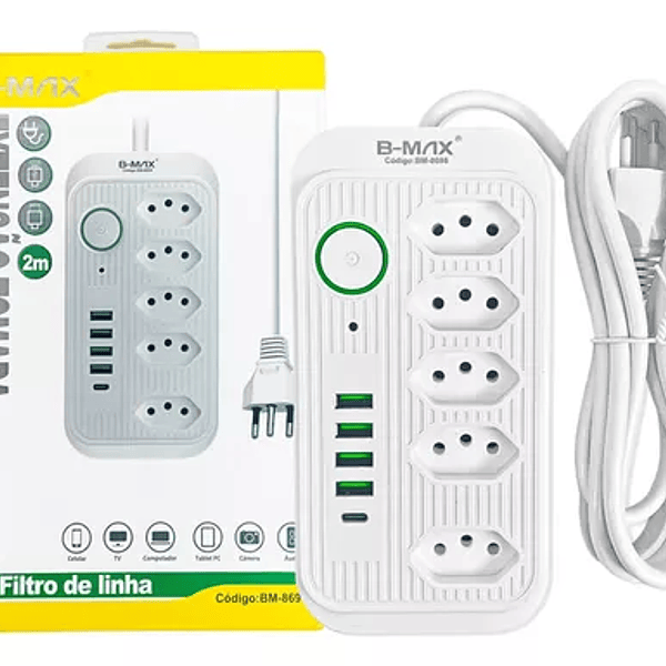 Filtro De Linha Bivolt,5 Tomada,4 USB + 1 TYPE-C 2m B-MAX