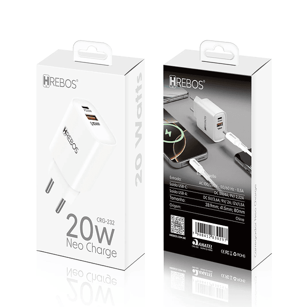 Fonte Carregador Turbo 20w 1 Type C + 1USB Hrebos